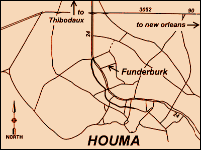 You can arrive to Houma from the West by either coming in on Highway  90 or on Highway 20.  The shortest way is to leave Highway 90 in the town of Gibson and get onto Highway 20 up to the town of Schriever.  Turn right on Highway 24 when you get to Schriever.  This highway is also Houma's Main Street. When you get to the 5800 block of Main Street, get in your left lane.  Go two more traffic lights.  At the end of the 6000 block, make a left turn onto Funderburk Avenue.  There is a furniture store there called Hart's Furniture.  Audrey's B&B is the last  house on the left at the very end of the street.  The exact address is 815 Funderburk Avenue.